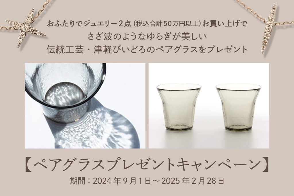 ご夫婦、パートナー、ご友人など、ブラウンダイヤモンド製品をおふたりで2点 税込合計50万円以上お買い上げのお客様へ、ブラウンダイヤモンド刻印入り「ワイヤードビーンズ」津軽びいどろペアグラスを差し上げます。